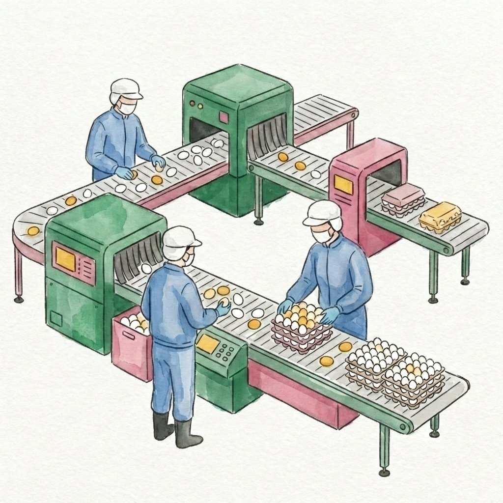 養鶏場から自動で集卵された鶏卵はGPセンター(鶏卵自動選別包装施設)へと運ばれ、洗卵、計量、選別、パッキング、梱包、出荷作業を行います。最新のテクノロジーを活用し、自動化を促進することで生産性向上を実現。大規模な拠点では、1日あたり約100万個のたまごを取り扱っています。品質維持にも注力し、殻の表面を叩いた音を分析して微細なワレやヒビを発見する破卵検査装置、血液の混じった鶏卵を取り除く異常卵検査装置などを導入し、安心して食べられるおいしいたまごの生産に取り組んでいます。スタッフは、各工程を担当する人材の管理や設備管理など日々の業務から課題を発見し、継続的改善に努めています。