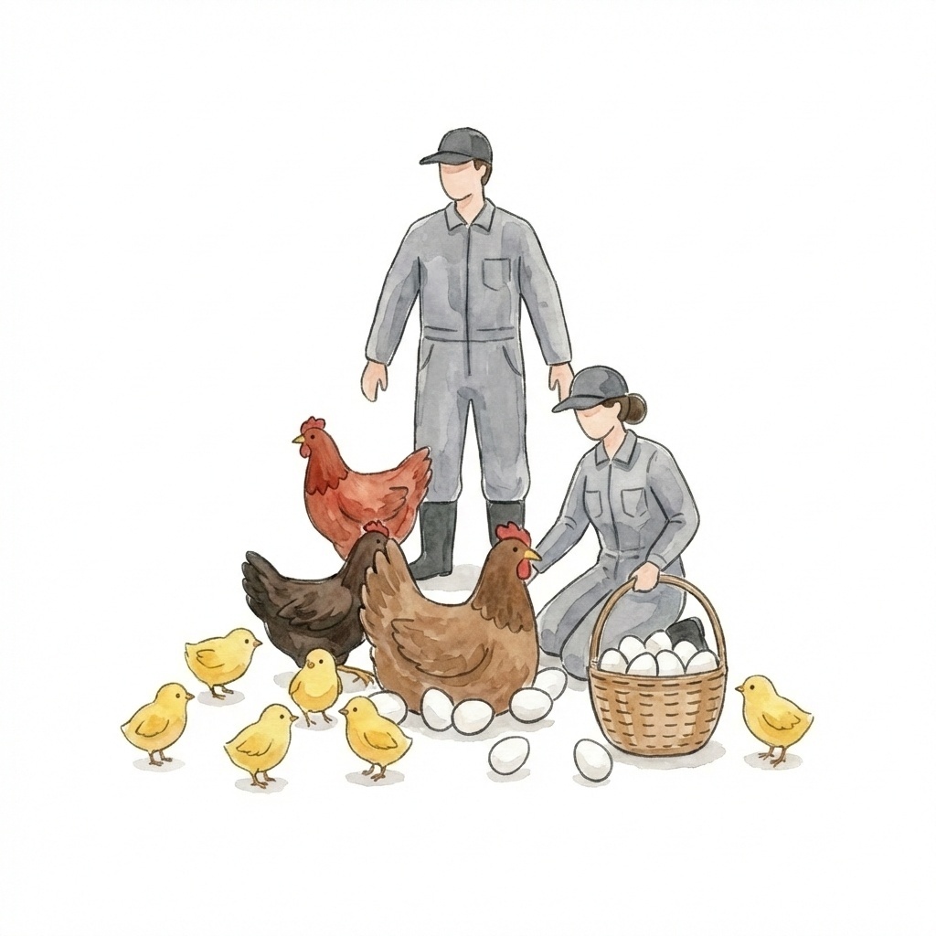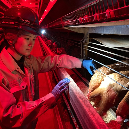 とはいえ、機械だけでは管理しきれないのが、生き物と向き合うということ。中でも、育雛農場に来て間もないヒナはまだ十分に体温調節ができないため、スタッフが直接看護飼育をします。農場を移動してからも、ワクチン接種や日々の観察など、人の手を介して鶏の健康管理に努めます。