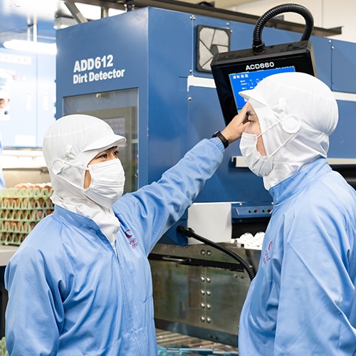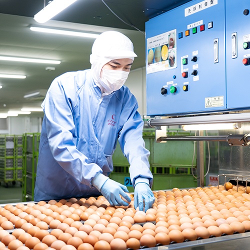 入社前の見学では理解していたつもりでした。でも、実際に働いてみると、畜産というより「工場」。扱っているものは確かに卵なんですけど、業務内容は部品工場に近い感覚で、最初は正直「思い描いていたものとちがう」という戸惑いがありました。ただ、考えてみれば、ここで扱う卵が毎日何万個と出荷され、日本中の食卓に届いている。第一次産業を支える立場であることに変わりはないし、これも大事な畜産の一部なんだと。そう思い直してからは、むしろ機械と向き合うこの仕事が面白くなっていきました。GPセンターって、検査装置から自動倉庫まで最新の機械がぎっしり並んでいて、重量・大きさ・強度・汚れ、すべてが自動で検査されるんです。じゃあ人間は何をするのかというと、「機械の面倒を見る」こと。これが想像以上に奥が深い仕事なんです。